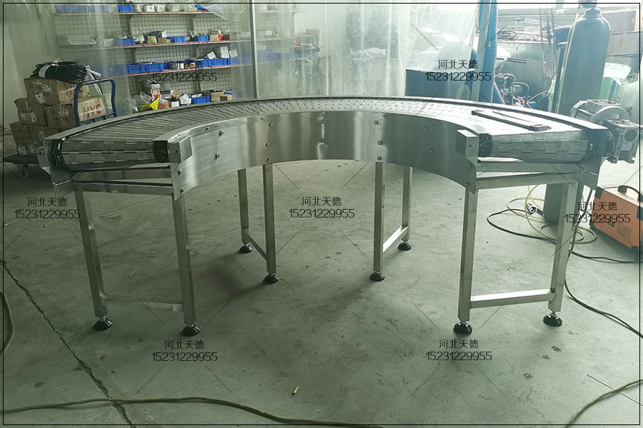 2. 鏈板轉(zhuǎn)彎?rùn)C(jī):采用金屬鏈板作為載體,結(jié)構(gòu)簡(jiǎn)單,承載力好,耐高溫,適合輸送重貨。