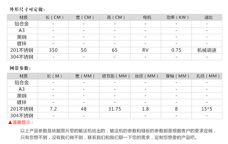 適用范圍:廣泛應(yīng)用于飲料瓶、鋁罐、藥品、化妝品、食品等行業(yè)的輸送,通過選用不同的網(wǎng)帶可以制作成儲瓶臺、提升機(jī)、殺 菌 機(jī)、蔬菜清洗機(jī)、以及肉食品輸送等行業(yè)專用設(shè)備??紤]網(wǎng)帶承受拉力限 制,單線長度一般不超過20米。