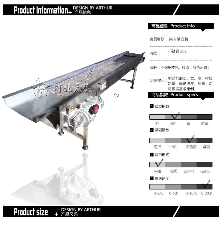 Structure: it's made up by sprockets, chains, wire mesh belt and dirve device, can choose different kind of wire mesh belts according to the goods' type, volume and weight.