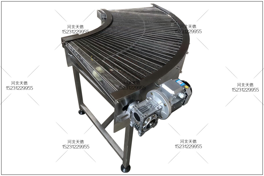 江西撫州客戶定制的轉(zhuǎn)彎網(wǎng)帶輸送機,用來加工輸送餅干,將生產(chǎn)好的餅干輸送到下一個工序進行包裝,這種輸送機采用鏈條式轉(zhuǎn)彎輸送帶,輸送帶內(nèi)徑鏈條節(jié)距為31.75毫米,外徑輸送鏈條的節(jié)距為50.8毫米,轉(zhuǎn)彎網(wǎng)帶輸送機采用不銹鋼304耐高溫耐腐蝕材質(zhì)板材進行加工,能在水里或者高溫情況下長期使用。